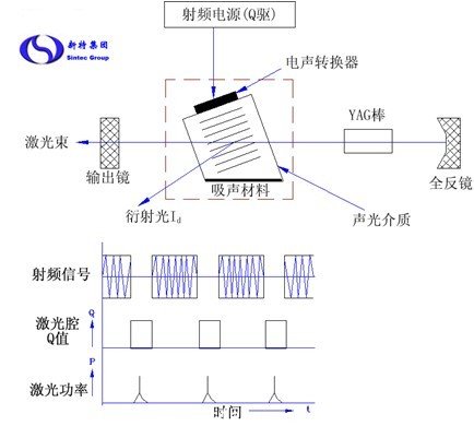 聲光Q開關(guān)是利用聲光相互作用以控制光腔損耗的Q開關(guān)技術(shù)。聲光調(diào)Q是通過電聲轉(zhuǎn)換形成超聲波使調(diào)制介質(zhì)折射率發(fā)生周期性變化, 對入射光起衍射作用, 使之發(fā)生衍射損耗,Q值下降, 激光振蕩不能形成。在光泵激勵下其上能級反轉(zhuǎn)粒子數(shù)不斷積累并達(dá)到飽和值, 之后突然撤除超聲場, 衍射效應(yīng)立即消失, 腔內(nèi)Q值猛增, 激光振蕩迅速恢復(fù), 其能量以巨脈沖形式輸出。這是一種廣泛應(yīng)用的Q開關(guān)方式,其主要優(yōu)點(diǎn)是重復(fù)頻率高,性能穩(wěn)定可靠。