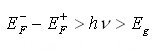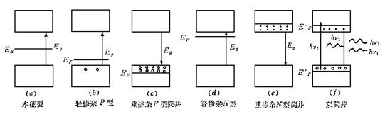 當(dāng)光照射到圖(3)所示的各種半導(dǎo)體時,在a—e的五種情況下,半導(dǎo)體中只有一個費(fèi)米能級,在它之上沒有電子,在它之下已充滿電子,因此不會發(fā)生電子向沒有被電子占據(jù)的空態(tài)躍遷,而只會將外來光子吸收。在圖(3)f所示的情況下有所不同,兩個費(fèi)米能級使得導(dǎo)帶中有自由電子,價帶中有空穴。如果外來光子的能量與上能帶中電子和下能帶中空穴之間的能量差相同,則會誘導(dǎo)導(dǎo)帶中電子向價帶中空穴躍遷而發(fā)出一個同樣的光子。當(dāng)外來光子的能量大于兩費(fèi)米能級