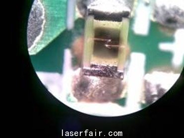 在與客戶協(xié)商后,我們建議使用激光調阻作為解決辦法。激光電阻微調是通過短脈沖激光掃描切割,改變電阻的導電截面積,達到把低于目標阻值的電阻體修調到阻值允許的偏差范圍內。利用激光束按一定軌跡照射在電阻膜片上,基片電阻漿料層受激光照射加熱汽化,形成一定深度的刻痕,從而改變了電阻體的導體截面面積和導電體長度,從而達到微調電阻的目的。同時,對電阻進行動態(tài)測量,將測量結果與設定阻值進行比較,并反饋控制激光的掃射運動,達到預定的要求。