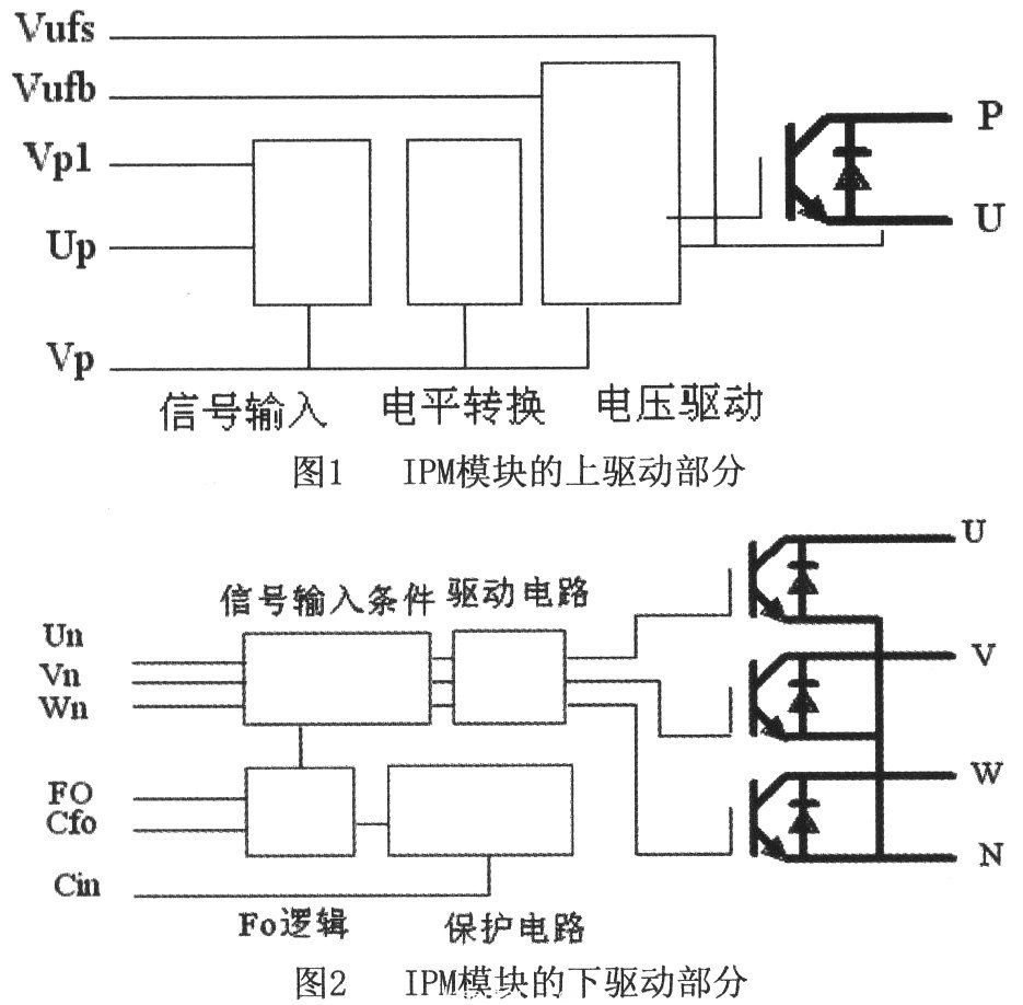 如上圖所示,圖1為IPM模塊的上驅(qū)動部分,圖2為IPM模塊的下驅(qū)動部分。一個完整的DIP-IPM模塊包括三個上驅(qū)動部分和一個下驅(qū)動部分,在圖1中給出的只是U相的驅(qū)動電路,V、W相與U相的電路完全相同。下面就結(jié)合內(nèi)部結(jié)構(gòu)對模塊進(jìn)行說明。