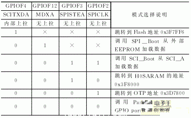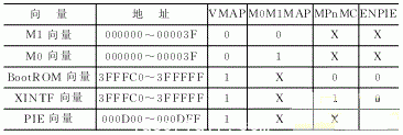 當(dāng)系統(tǒng)重啟(上電或熱啟動)時(shí),引腳XMPNMC的信號將被鎖存到XINTF的配置寄存器XINTCNF2中。重啟之后,XMPNMC的狀態(tài)不再反映到XINTCNF2,這時(shí),可以用軟件來修改它的狀態(tài),從而確定程序要訪問的是內(nèi)部地址還是外部地址。但是,像F2810這樣的器件,沒有XINTF。它的XMPNMC在芯片內(nèi)部被拉低,也就是說,當(dāng)器件重啟后,它總是自動從內(nèi)部的BootROM啟動。如果XMPNMC為高電平,則表示系統(tǒng)將從XINTF zone7中獲取復(fù)位向量。即從外部獲取中斷向量(地址見表1)時(shí),必須確保復(fù)位向量所指向正確的地址。這一般在希望自己編寫啟動程序時(shí)使用。本文對此不作具體討論。