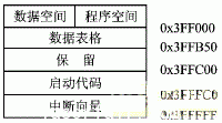 在F281x、C281x、R281x器件中都有一塊4K×16位的BootROM。當(dāng)引腳MP/nMC的狀態(tài)反映到XINTCNF2中為0時(shí),BootROM被映射到地址空間0x3FF000~0x3FFFC0上。片上ROM在出廠前就已經(jīng)燒寫好了一個(gè)啟動程序以及一些其他數(shù)據(jù)和表格(版本信息、復(fù)位向量、中斷向量表、IQmath表等)。其空間分配如圖1所示。