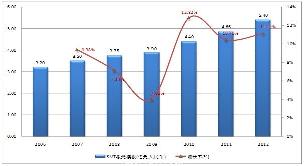 首先,我們先討論激光漏印模板中的SMT激光模板,下表是2006~2012年中國SMT激光模板的市場容量估計圖: