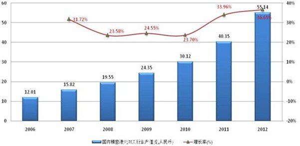 根據(jù)國家科技部基礎(chǔ)研究司《我國激光產(chǎn)業(yè)發(fā)展對策》研究報告顯示,國外已建立有約5000個激光加工站,而我國現(xiàn)只有120個左右的激光加工站或加工中心,未來發(fā)展具有很大的潛力。根據(jù)統(tǒng)計,2008年我國與電子信息行業(yè)相關(guān)的專業(yè)精密激光制造和服務(wù)業(yè)收入19.55億元,隨著精密激光對傳統(tǒng)制造的不斷地替代和突破,精密激光制造正不斷地滲透到傳統(tǒng)制造中,保守估計,未來三年內(nèi)我國精密激光加工行業(yè)將保持平均每年30%的增長率,中國精密激光制造與服務(wù)行業(yè)的產(chǎn)值將由2008年的19.55億元人民幣增長到2012年的55.14億元,市場容量較大,市場前景良好。