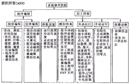 該系統(tǒng)軟件提供的編程方式有三種:圖形編程,仿形編程,手工編程。手工編程只是圖形編程和仿形編程中的一個功能模塊,即全屏幕程序編輯,所以沒有在軟件框圖中單列。