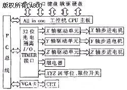 數(shù)控火焰切割機機械部分主要由底座、龍門式移動框架、火焰噴頭、傳動機構和三個步進電機組成(圖略),以實現(xiàn)對平面板材零件的切割加工。三個步進電機分別控制龍門框架的前后移動(Y電機)、火焰噴頭的左右(X電機)和上下移動(Z電機),X、Y、Z三軸可以實現(xiàn)聯(lián)動控制。數(shù)控系統(tǒng)的硬件結構如圖1所示。該控制系統(tǒng)以IPC(486以上CPU,8MB以上內存,500MB以上硬盤)作為主機,除了IPC的固有硬件(CPU主板、TVGA卡、電源),只在插槽中增加了一塊32位光隔離I/O.TIMER(并行輸入輸出/定時器)卡。由該卡的I/O并行口控制三個步進電機的運行、乙炔開關、乙炔點火、切割氧開關以及接收工作臺的限位行程開關信號、坐標零位信號。由板上的8253定時器作為步進電機運行中斷服務程序的中斷定時器,時鐘頻率取2MHz。通過計算機的鍵盤實現(xiàn)對控制系統(tǒng)的操作。三個移動方向步進電機的脈沖當量均為0.01mm。由于486以上PC機高的運行速度,完全可以用一個CPU完成從系統(tǒng)程序管理到加工控制的所有工作,沒有必要采用上、下位機的多CPU結構。