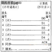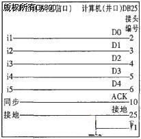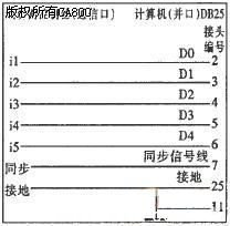 與應(yīng)答傳輸類似,同步傳輸也是通過計(jì)算機(jī)并口的2、3、4、5、6針腳輸出信號模擬光電頭的方式。在同步傳輸方式下計(jì)算機(jī)并口與線切割控制器通信口的常用接線圖如圖4所示。