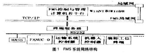 (1)物理層:是指用來執(zhí)行這種通信的硬件,包括數(shù)據(jù)線和控制線本系統(tǒng)中采用RS232串口,機(jī)器人一端為9針D形接頭,另一端RJ-45接頭連到了終端服務(wù)器TerminalServer擴(kuò)展的串行接口上,然后通過終端服務(wù)器的網(wǎng)絡(luò)接口與FMS局域網(wǎng)相連、最終實(shí)現(xiàn)與機(jī)器人控制算機(jī)的連接。硬件平臺如圖1。