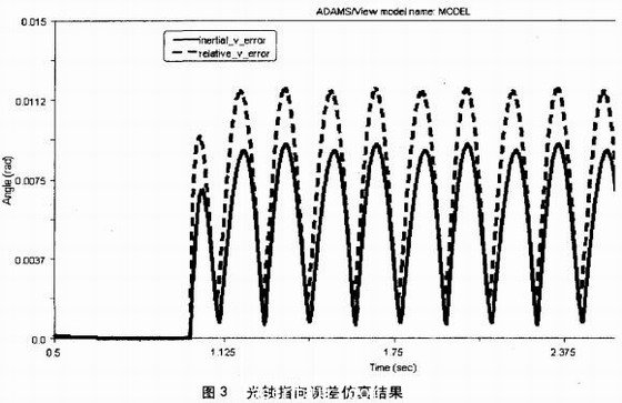 以隨動系統(tǒng)復(fù)現(xiàn)相對慣性空間穩(wěn)定的輸入為例,為進(jìn)一步比較兩種方案,我們利用ADAMs軟件和MATLAB軟件一起進(jìn)行了位標(biāo)器運(yùn)動學(xué)、動『J學(xué)和控制系統(tǒng)聯(lián)合仿真。仿真條件假設(shè)目標(biāo)在空間靜止,在中環(huán)通道,分別利用陀螺速度反饋和測速機(jī)速度反饋,在彈體擺動情況下,進(jìn)行目標(biāo)指示信息的隨動,對指向誤差(即光軸與視線的夾角)的大小進(jìn)行記錄,仿真結(jié)果如圖3所示。#p#分頁標(biāo)題#e#