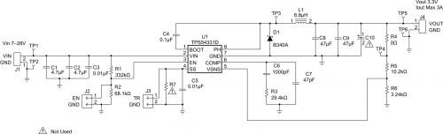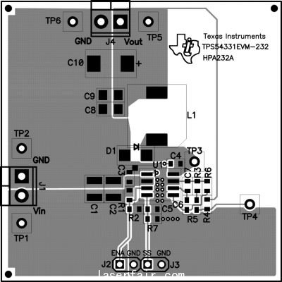 制造商對這款產(chǎn)品提供了大量的技術(shù)支持。TPS54331 [1 ]的產(chǎn)品說明書提供了器件信息資料,例如:典型器件特性、產(chǎn)品的詳細描述以及電路設(shè)計指導(dǎo)等。除詳細的產(chǎn)品產(chǎn)品說明書以外,還提供有一個評估模塊[2]。該模塊為您提供了一個硬件平臺(圖 1),通過它您可以在最終電路設(shè)計階段對您的電路(圖 2)進行測量和修改。