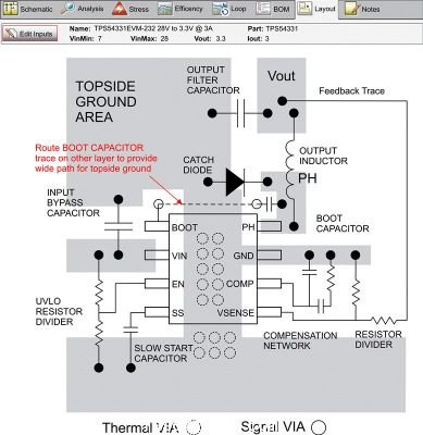 SwitcherPro 軟件為您提供電源設(shè)計的電路圖和布局建議。一旦您運行了軟件,您便會注意到窗口左側(cè)的 EVM 設(shè)計選項。例如,您會在給出的列表中找到 TPS54331 EVM。3 顯示了 DC/DC 轉(zhuǎn)換器 TPS54331 的 SwitcherPro 布局建議。圖 1 和圖 3 所示布局都經(jīng)過了測試和驗證。