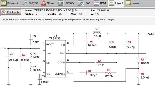 SwitcherPro 工具還為您提供了修改電路要求的機會,甚至可以修改示意圖中的組件。通過復(fù)制 EVM 設(shè)計,然后選擇編輯電路選項,便可以進行修改。這樣一來,您就可以修改 DC/DC 轉(zhuǎn)換器的輸入最小值和最大值,也可以修改輸出電壓和電流要求。軟件還具有一般分析、應(yīng)力分析、效率分析和回路分析功能,方便您評估電路。