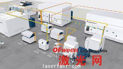 利用光纖傳導(dǎo)激光是固體激光器最大的優(yōu)點(diǎn)。光纖不僅是機(jī)床設(shè)備內(nèi)部傳導(dǎo)激光的載體,還可以實(shí)現(xiàn)遠(yuǎn)距離的激光傳送。這樣就可以節(jié)省生產(chǎn)場(chǎng)地的面積,把固體激光源單獨(dú)建在生產(chǎn)車間旁,利用Trumpf公司研發(fā)生產(chǎn)的激光網(wǎng)把固體激光傳導(dǎo)到多臺(tái)激光加工機(jī)床上(見(jiàn)圖2)。