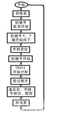 其工作過程為:當(dāng)貨物到達(dá)時,機(jī)械手系統(tǒng)開始動作;步進(jìn)電機(jī)控制開始向下運(yùn)動,同時另一路步進(jìn)電機(jī)控制橫軸開始向前運(yùn)動;伺服電機(jī)驅(qū)動機(jī)械手旋轉(zhuǎn)到達(dá)正好抓取貨物的方位處,然后充氣,機(jī)械手夾住貨物。