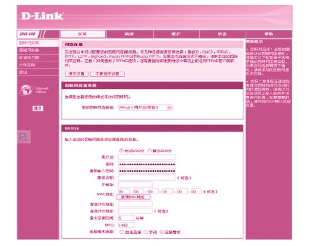 (6)登錄后,進(jìn)入“安裝向?qū)?rdquo;,選擇互聯(lián)網(wǎng)連接方式為動態(tài)pppoe(dsl),輸入用戶名和密碼(即為向電信申請的賬戶密碼),選擇連接模式為總是連接,然后“保存設(shè)置”,這樣就實現(xiàn)了路由器自動撥號登錄上網(wǎng),而無需手動撥號。這也為后續(xù)en01-sl的聯(lián)網(wǎng)提供了基礎(chǔ)。如圖4所示。