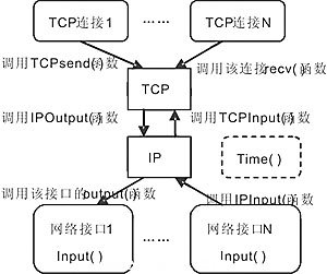 其中,Timer()函數(shù)調(diào)用TCPTimer()處理TCP數(shù)據(jù)包重發(fā),以及調(diào)用每個接口的Input()函數(shù)接收到達的數(shù)據(jù)包。Timer()函數(shù)必須在短時間(一般<20ms)內(nèi)被調(diào)用一次,否則接收數(shù)據(jù)包和TCP定時等功能將停止。