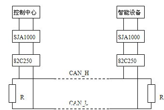 CAN總線系統(tǒng)一般連接結(jié)構(gòu)如圖(以芯片82C250為例)所示,R=120Ω。(注:圖中僅畫出了一個(gè)智能設(shè)備,實(shí)際中可以最多達(dá)110個(gè))