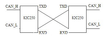 該方案就是在總線線路中直接加入兩個(gè)發(fā)送芯片(采用82C250為例)[3],并把發(fā)送芯片的管腳TXD和RXD對(duì)連。其連接電路如下: