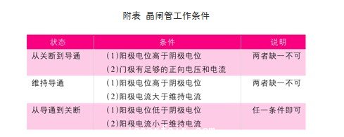 由于晶閘管只有導(dǎo)通和關(guān)斷兩種工作狀態(tài),所以它具有開關(guān)特性,這種特性需要一定的條件才能轉(zhuǎn)化,此條件如附表所示。