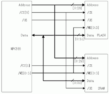 圖2 MPC555微控制器外擴(kuò)Flash和SRAM存儲(chǔ)器的連接圖