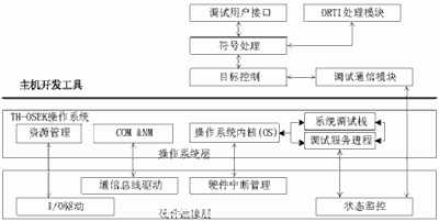 對(duì)于系統(tǒng)的診斷和測(cè)試,本設(shè)計(jì)側(cè)重于提供一個(gè)實(shí)現(xiàn)診斷和測(cè)試服務(wù)的平臺(tái)和手段,而不關(guān)心具體的診斷和測(cè)試項(xiàng)目,這部分功能用戶可以根據(jù)具體情況在系統(tǒng)支持下進(jìn)行定義。OSEK ORTI實(shí)現(xiàn)系統(tǒng)診斷測(cè)試應(yīng)用的基本服務(wù)支持,提供對(duì)OSEK操作系統(tǒng)進(jìn)行查詢和監(jiān)控的接口,通過(guò)這個(gè)接口上層的診斷服務(wù)可以獲取自己所關(guān)心的系統(tǒng)信息,并為診斷服務(wù)提供對(duì)目標(biāo)操縱的基本手段。這部分是系統(tǒng)診斷和測(cè)試功能的實(shí)現(xiàn)基礎(chǔ),與診斷通信服務(wù)一起實(shí)現(xiàn)對(duì)目標(biāo)的分布式調(diào)試與診斷。