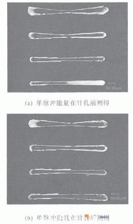 從圖4和圖5中可以看出,單脈沖能鼉較低時,不管是開孔還是一定針孔作用下焦點附近脈沖形狀不存在明顯紡錐型分布,但加針孔后焦點附近光束半徑變化還是舒緩了很多,較利于進一步做深加工與切割方面的研究;隨著針孔直徑的降低,能夠?qū)崿F(xiàn)燒蝕的區(qū)域在明顯減?。ㄐ∮谌鹄L度),這主要是針孔限制了大部分能量到達材料表面;小孔直徑為4mm時,脈沖傳輸形狀受激光能量的影響相對較小;與圖3類似,實驗另一個現(xiàn)象就是隨著針孔孔徑的減小,聚焦區(qū)域的最小束腰半徑處向靠近透鏡方向移動,這一點可以用聚焦束腰半徑與聚焦前束腰與透鏡前表面距離的變化關系來很好解釋。