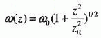 而焦點附近軸向范圍內(nèi)光束半徑ω(z)的變化是與瑞利長度和焦點處束腰半徑有關的函數(shù),如圖2所示,其表達式為: