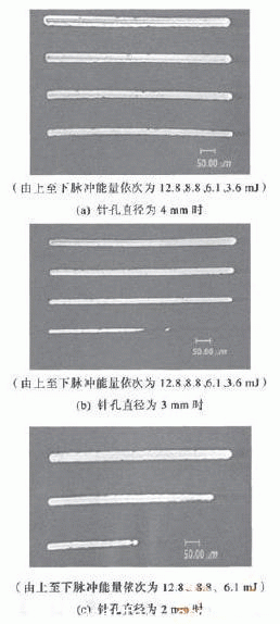從圖3(a)可以看出,不加針孔(開孔)時,燒蝕區(qū)域在焦點附近基本為對稱分布,且偏離焦點位置時,燒蝕線寬迅速增加,成紡錐型分布。隨著小孔加入,通光尺寸變小,燒蝕區(qū)域線性尺度逐漸降低,聚焦點位置與兩翼燒蝕線寬差異明顯減少,甚至有遠離透鏡跡象(見針孔直徑為2mm的情況)。改變脈沖能量而保證小孔后的能量一致,燒蝕現(xiàn)象沒有明硅差異(見圖3(b)),只是燒蝕線寬有所加大。上述現(xiàn)象通過式(1)和(2)可以很好的解釋:加入小孔后,由于孔徑的限制,使得照射到透鏡表面束腰半徑ω減小,造成焦點處的束腰半徑ω0有所增加,瑞利長度ZR變大,因而在式(2)中,焦點附近束腰半徑ω(z)隨z的變化比不加小孔時減弱,宏觀上就得到了圖3中比較平緩的加工結(jié)果。