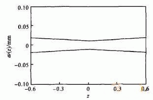 圖2 光束束腰半徑(ω(z))在焦點附近隨傳輸方向變化示意圖