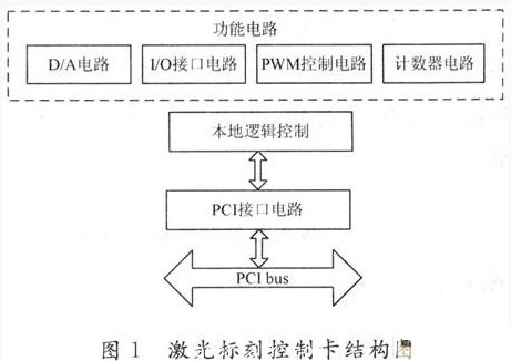 激光標(biāo)刻系統(tǒng)控制卡是整個(gè)控制系統(tǒng)的中樞,連接著控制軟件與執(zhí)行機(jī)構(gòu)??刂瓶ńY(jié)構(gòu)如圖1所示,包括基于PCI總線接口控制電路、本地邏輯控制電路及功能電路等3部分組成。