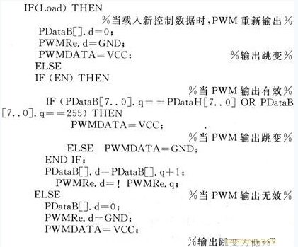 軟核內(nèi)部控制語(yǔ)句如下,其中PWMDATA為PWM波輸出的控制邏輯,當(dāng)其輸出為高電平時(shí),輸出進(jìn)行翻轉(zhuǎn)。
