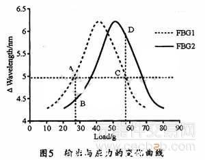 當(dāng) PD1對(duì)應(yīng)處理后的電壓信號(hào)值為5 V時(shí),對(duì)應(yīng)的點(diǎn)為A和C,即對(duì)應(yīng)的有兩個(gè)光纖布拉格光柵的波長值。因此,對(duì)于這個(gè)5 V電壓,解調(diào)系統(tǒng)無法直接判斷出對(duì)應(yīng)的懸臂梁負(fù)載的質(zhì)量是A點(diǎn)還是C點(diǎn)所對(duì)應(yīng)的質(zhì)量。對(duì)于雙光柵匹配解調(diào)系統(tǒng),往往會(huì)存在兩個(gè)匹配光柵并對(duì)應(yīng)兩個(gè)光電探測器。除存在PD1外,還存在PD2。系統(tǒng)可以通過PD1和PD2兩者所對(duì)應(yīng)的電壓值來確定產(chǎn)生5V電壓時(shí)所添加的砝碼質(zhì)量。實(shí)際上,可通過DSP系統(tǒng)的運(yùn)算處理得到匹配光柵中心波長的變化量,從而得到傳感光柵的中心波長變化量。對(duì)于雙光柵匹配解調(diào)系統(tǒng),對(duì)應(yīng)的傳感光柵可以取反射譜的雙邊,從而擴(kuò)大傳感光柵的測量范圍。光電探測器的輸出經(jīng)信號(hào)調(diào)理電路后的電壓隨應(yīng)力的變化曲線如圖5所示。
