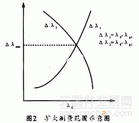普通的匹配法只有一個(gè)傳感光柵一個(gè)匹配光柵,對(duì)應(yīng)只有一個(gè)△λ。當(dāng)該△λ≥△λmin時(shí),解調(diào)系統(tǒng)將無法繼續(xù)解調(diào)。對(duì)于雙光柵匹配解調(diào)系統(tǒng),傳感光柵與兩個(gè)并聯(lián)的匹配光柵的中心波長近似相等,但略有差別。三者關(guān)系為:λp1<λc<λp2,λp1和λp2分別表示兩個(gè)匹配光柵的中心波長。λc是傳感光柵的中心波長。傳感光柵在外界應(yīng)力作用下時(shí),△λ1=?λc-λp1?,△λ2=?λc-λp2?;當(dāng)λc增大時(shí)△λ1增大,△λ2減小;當(dāng)λc減小時(shí),△λ1減小,△λ2增大。圖2所示為△λ1、△λ2和λc三者的關(guān)系圖,其中△λmin是光電探測器可以探測到的最小值。因此,根據(jù)圖2可知,在理論上,雙光柵匹配解調(diào)系統(tǒng)總是至少有一個(gè)光電探測器可以探測到可用光信號(hào)。