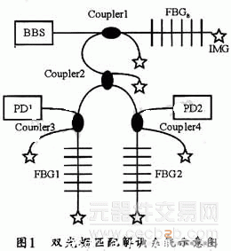 光纖布拉格光柵傳感器(FBGS)是用光纖布拉格光柵(FBG)作敏感元件的功能型光纖傳感器,可用于直接檢測溫度和應(yīng)變,以及與溫度和應(yīng)變有關(guān)的其他許多物理量和化學(xué)量的間接測量。在光纖布拉格光柵傳感器的應(yīng)用研究中,波長解調(diào)是一個(gè)重要的方面。目前限制光纖光柵傳感器應(yīng)用的最主要障礙是傳感信號(hào)的解調(diào)。波長解調(diào)方法主要有光譜儀、斜邊濾波法、可調(diào)諧濾波法、干涉掃描法、匹配光柵法等。但是,在這幾種方法中,光譜儀成本較高,斜邊濾波法的分辨率較小,干涉儀沒有好的重復(fù)性,而可調(diào)諧濾波器的掃描周期較長。因此,近年來,匹配光柵法越來越受到人們的青睞。為此,文中介紹了一種簡單、廉價(jià)且由兩個(gè)并聯(lián)的匹配光柵解調(diào)來檢測光纖光柵傳感器的系統(tǒng)設(shè)計(jì)方法。