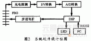 匹配光柵反射回來的光入射到光電探測器(PD)上可轉(zhuǎn)換為電信號(hào)。光電轉(zhuǎn)換部分和信號(hào)采集部分主要完成對(duì)PD輸出電信號(hào)的采集,采集到的信號(hào)再轉(zhuǎn)化為#p#分頁標(biāo)題#e#數(shù)字信號(hào)由DSP進(jìn)行處理。DSP主要完成數(shù)據(jù)的插值運(yùn)算和尋峰處理,并根據(jù)處理結(jié)果反饋給DSP,由DSP依照反饋信號(hào)控制步進(jìn)電機(jī)完成下一步的解調(diào)工作,其系統(tǒng)硬件框圖如圖3所示。