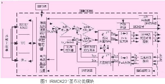 IRMCK201是基于數(shù)字同步旋轉(zhuǎn)矢量控制的交流伺服驅(qū)動的單片硬件解決方案。圖1所示為其基本功能模塊。