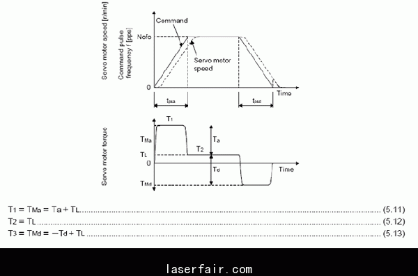 與加減速的輸出力矩相比,電機(jī)在帶動(dòng)負(fù)載在運(yùn)行中的輸出力矩是最小的,用TL表示。這個(gè)值可以用伺服設(shè)置軟件在監(jiān)控伺服電機(jī)輸出力矩曲線上可以監(jiān)控到。那么由圖5可以計(jì)算出電機(jī)在加速,運(yùn)行和減速過(guò)程中的輸出力矩T1,T2和T3。