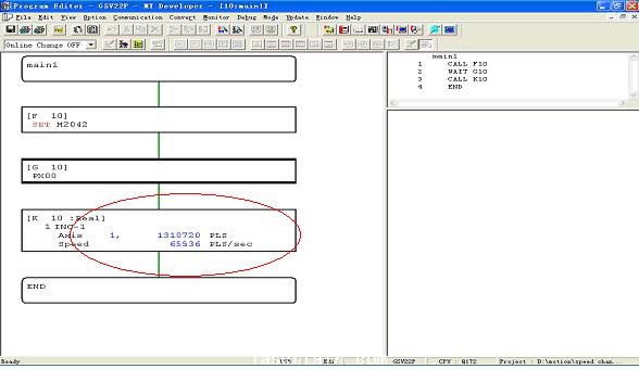 則上電運(yùn)行后兩個(gè)程序都被激活,如果此時(shí)將X0置為ON這可以啟動(dòng)main1的定位運(yùn)動(dòng),在定位的過(guò)程中如果再將X1置為ON,則可將正在進(jìn)行的定位運(yùn)動(dòng)的速度由65536PLS/sec改變成131072PLS/sec,速度提高一倍(新速度值也可以間接指定)。