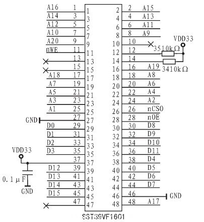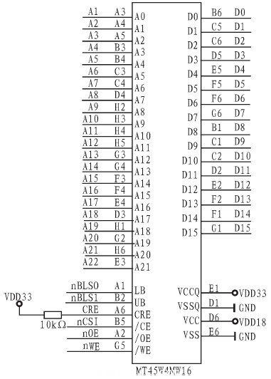 主節(jié)點(diǎn)采用的SRAM和NORFLASH分別是MT45W4MW16、SST39VF1601.MT45W4MW16是一個(gè)16位、8 MB容量的PSRAM.SST39VF1601是一個(gè)16位的CMOS多功能Flash MPF器件,儲(chǔ)存容量為2 MB.其電路連接如圖5、圖6所示。