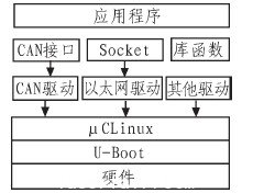 主節(jié)點(diǎn)軟件結(jié)構(gòu)如圖3所示,U-Boot作為BootLoader(啟動(dòng)引導(dǎo)程序),負(fù)責(zé)初始化目標(biāo)板硬件與引導(dǎo)操作系統(tǒng)。這里采用μCLinux作為嵌入式操作系統(tǒng)。μCLinux(microcontrol linux)即“微控制器領(lǐng)域中的Linux系統(tǒng)”,主要是針對(duì)目標(biāo)處理器沒有存儲(chǔ)管理單元(MMU)的嵌入式系統(tǒng)而設(shè)計(jì)的。它保留了Linux的大多數(shù)優(yōu)點(diǎn):穩(wěn)定、良好的移植性、優(yōu)秀的網(wǎng)絡(luò)功能、對(duì)各種文件系統(tǒng)完備的支持和標(biāo)準(zhǔn)豐富的API.同時(shí)μCLinux包含大量的設(shè)備驅(qū)動(dòng)程序,以及提供良好的驅(qū)動(dòng)程序開發(fā)框架。驅(qū)動(dòng)程序開發(fā)或配置主要包括CAN、以太網(wǎng)以及NANDFLASH3大部分。上層應(yīng)用程序通過使用CAN接口函數(shù)、Socket接口以及庫(kù)函數(shù)進(jìn)行各種應(yīng)用開發(fā)。整個(gè)系統(tǒng)的啟動(dòng)過程是:U-Boot把μCLinux內(nèi)核從NORFLASH中加載到SRAM中,然后啟動(dòng)μCLinux,μCLinux初始化硬件及建立運(yùn)行環(huán)境后,自動(dòng)運(yùn)行預(yù)設(shè)的應(yīng)用程序。