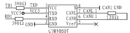 LPC2294內(nèi)部集成了4路CAN控制器。每個(gè)總線上的數(shù)據(jù)傳輸速率高達(dá)1 Mb/s,兼容CAN2.0B.LPC2294沒有集成CAN收發(fā)器,無法將TTL電平轉(zhuǎn)換為CAN總線的差分電平信號(hào)。因此主節(jié)點(diǎn)采用了帶有隔離功能的CTM1050T作為CAN收發(fā)器。在CAN總線兩端須連接120Ω的電阻,以匹配總線阻抗,提高數(shù)據(jù)通信的抗干擾性及可靠性。以下是1路CAN收發(fā)器的電路圖,其余3路連接方式與此一樣。
