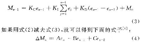 由式(4)可知,增量式PID算法建立在對普通PID算法進(jìn)行改進(jìn)的基礎(chǔ)之上。它克服了位置式PID對所有過去狀態(tài)的依賴,計(jì)算機(jī)控制器輸出的只是增量,所以誤動作的時候?qū)敵龅挠绊懕容^小,必要的時候可以使用邏輯判斷的方法將這種影響消除,因而不會嚴(yán)重影響系統(tǒng)的工況。由于算式中不需要對誤差進(jìn)行累加,控制增量△Mn的確定僅與最近的n,n-1,n-2次的采樣值有關(guān),較容易的通過加權(quán)處理而獲得比較好的控制效果。