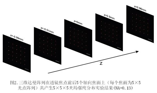 該課題組研究人員指出,結(jié)合這種達曼波帶片和另一個二維達曼光柵,可以在透鏡的后場實現(xiàn)按照規(guī)則晶格結(jié)構(gòu)排布的聚焦光斑三維陣列,即三維達曼陣列。研究人員通過實驗,在一個NA0.13和一個NA0.66物鏡的聚焦后場分別實現(xiàn)了5×5×5和6×6×7聚焦光斑陣列。這種按照規(guī)則晶格結(jié)構(gòu)排布的三維達曼陣列在三維激光直寫光刻、三維光存儲、并行光學粒子操控等方面有廣泛的應(yīng)用前景。