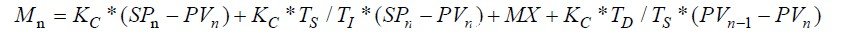 對(duì)于模擬量信號(hào)的控制PID(比例+積分+微分)算法控制。S7-200 系列PLC有專(zhuān)門(mén)的PID回路指令, 對(duì)模擬量進(jìn)行PID控制十分方便。PID指令使用的算法:( n SP 為第n個(gè)采樣時(shí)刻的給定值, n為過(guò)程變量值, MX 為積分項(xiàng)值)