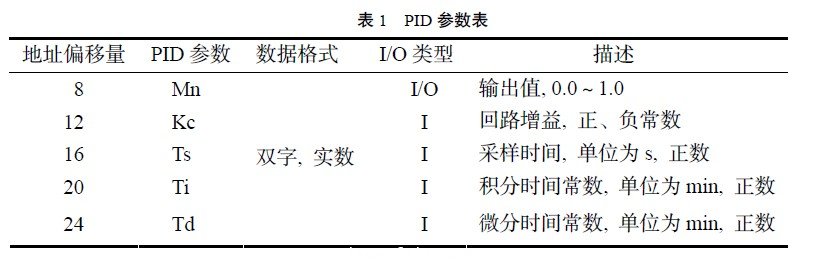 PID 指令根據(jù)表格(TBL)中的輸入和配置信息對(duì)引用LOOP執(zhí)行PID 循環(huán)計(jì)算。在執(zhí)行PID 指令前, 要建立一個(gè)參數(shù)表, 一般要對(duì)表1 中的參數(shù)進(jìn)行初始化處理。