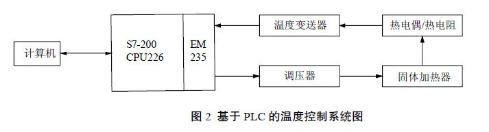 信號(hào)處理、溫度調(diào)節(jié)等功能,。一個(gè)溫度控制系統(tǒng)一般具有溫度信號(hào)采集、PLC的溫度控制系統(tǒng)中度信號(hào)的采集可以使用常用的溫度傳感器(熱電偶、熱電阻)。由溫度傳感器檢測(cè)來(lái)的信號(hào)不是標(biāo)準(zhǔn)的電壓(電流)信號(hào), 不能直接送給A/D轉(zhuǎn)換模塊.因此溫度傳感器采集到的溫度信號(hào)要經(jīng)過(guò)變送器的處理后才能被A/D轉(zhuǎn)換器識(shí)別并轉(zhuǎn)換為相應(yīng)的數(shù)字信號(hào)。根據(jù)所使用的溫度傳感器選用對(duì)應(yīng)的溫度變送器。S7-200系列PLC常用的模擬量輸入輸出混合模塊為EM235, EM235為4路模擬量輸入, 1路模擬量輸出。PLC對(duì)溫度信號(hào)進(jìn)行處理后, 通過(guò)模擬量模塊輸出電流信號(hào), 電流信號(hào)可以通過(guò)調(diào)壓器來(lái)控制電源的開(kāi)度(即一周期內(nèi)的導(dǎo)通比率), 從而控制電源的輸出功率。加熱器根據(jù)電源輸出功率調(diào)節(jié)加熱強(qiáng)度, 從而達(dá)到溫度調(diào)節(jié)的效果.其系統(tǒng)如圖2所示。