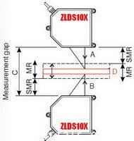在被測體上方和下方各安裝一個激光位移傳感器,被測體厚度D=C-(A+B)。其中,C是兩個傳感器之間距離,A是上面?zhèn)鞲衅鞯奖粶y體之間距離,B是下面?zhèn)鞲衅鞯奖粶y體之間距離。圖中:SMR是指傳感器量程起始間距,MR是指傳感器量程。