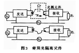 用光傳輸信號(hào)是解決地環(huán)路問題的理想方法。如圖3所示,光耦器件的寄生電容為2 pF左右,因此能夠在很高的頻率起到隔離作用。如果使用光纖,則沒有寄生電容的問題,能夠獲得十分完善的隔離效果。但是,用光纖會(huì)帶來其它問題,如:需要更大的功率、需要更多的外圍器件,光連接的線形和動(dòng)態(tài)范圍都達(dá)不到模擬信號(hào)的要求、光纜的安裝和維護(hù)比較復(fù)雜等,使用時(shí)應(yīng)注意。