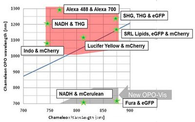 隨著緊湊型光學(xué)參量振蕩器的不斷發(fā)展,如相干公司的ChameleonCompactOPO,人們對(duì)使用波長大于1080nm激光的興趣也在不斷增加。通過使用集成式控制器即可輕松將波長調(diào)諧至1600nm,操作非常簡(jiǎn)便。此外,使用可選的fan-poledOPO晶體,可以讓鈦寶石激光器和OPO在不改變光束指向的條件下實(shí)現(xiàn)獨(dú)立調(diào)諧,這對(duì)于多模式成像是非常理想的。現(xiàn)在又增加了一個(gè)將OPO輸出倍頻得到可見光的選項(xiàng),進(jìn)一步增加了多模式成像的選擇(見圖3)。