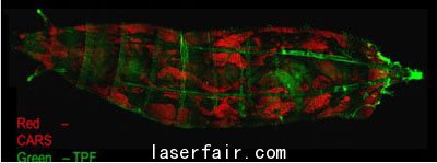 圖2:多模式成像案例--偽彩色果蠅幼蟲全身成像。紅色是無標(biāo)記CARS信號(hào),綠色是雙光子熒光信號(hào)。
